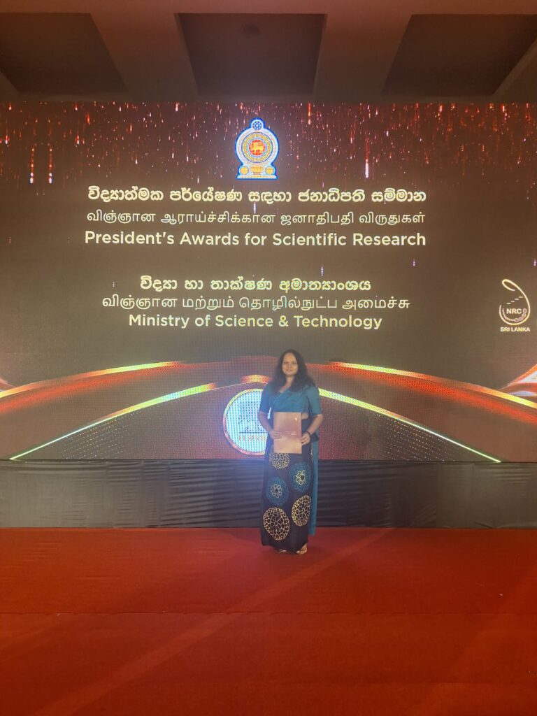 This prestigious national award was conferred in recognition of Dr. Jayasinghe’s outstanding research contributions through her publications from the year 2021, reflecting her commitment to high-quality scholarly work and her significant contribution to the advancement of scientific research in Sri Lanka.