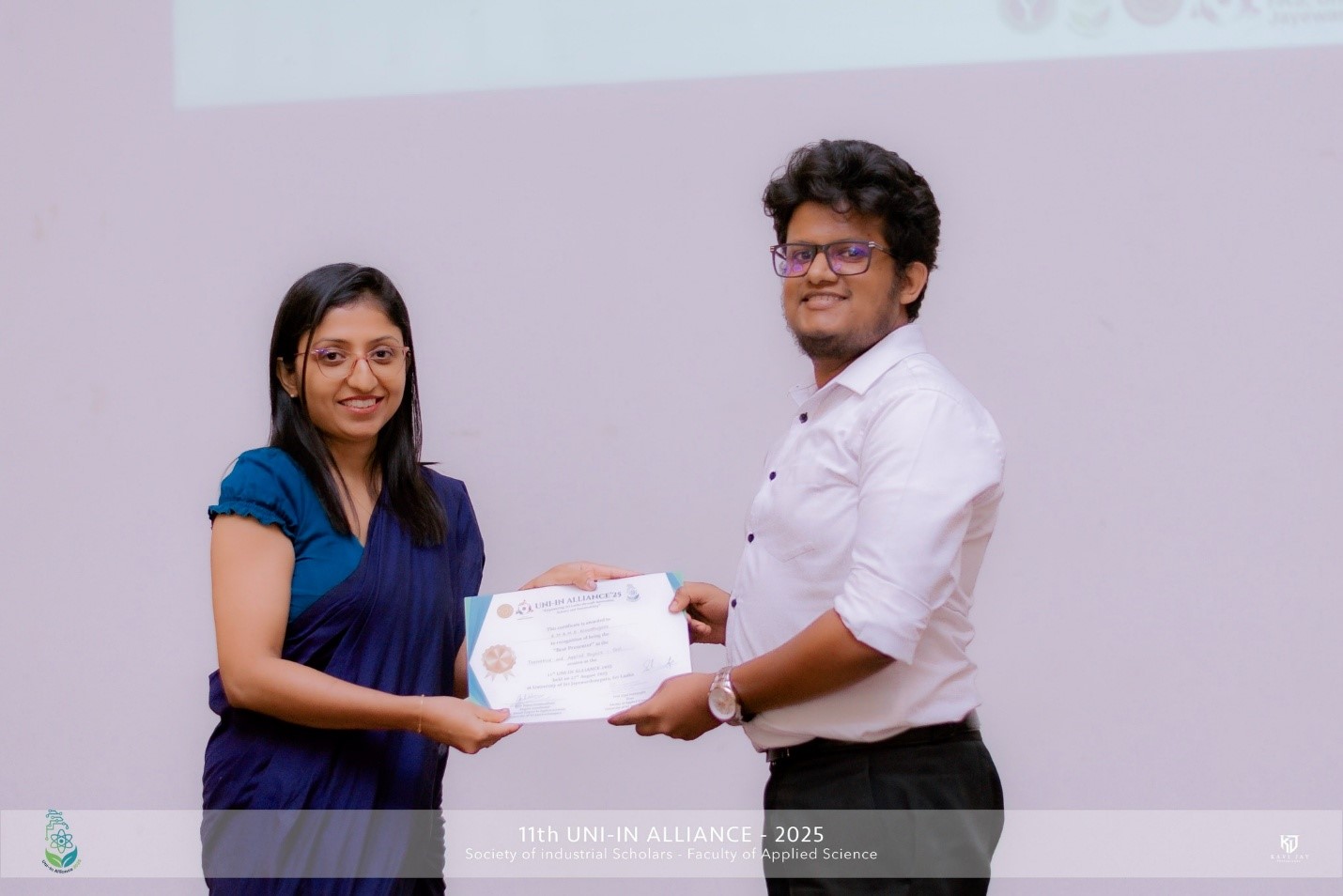 Mr. R. M. B. M. B. Alawathugoda from the Department of Physics was awarded the title of “Best Presenter” in the Theoretical and Applied Physics – Oral presentations session at the 11th Undergraduate research symposium “UNI-IN ALLIANCE 2025”, held on 27th August 2025 at the University of Sri Jayewardenepura.