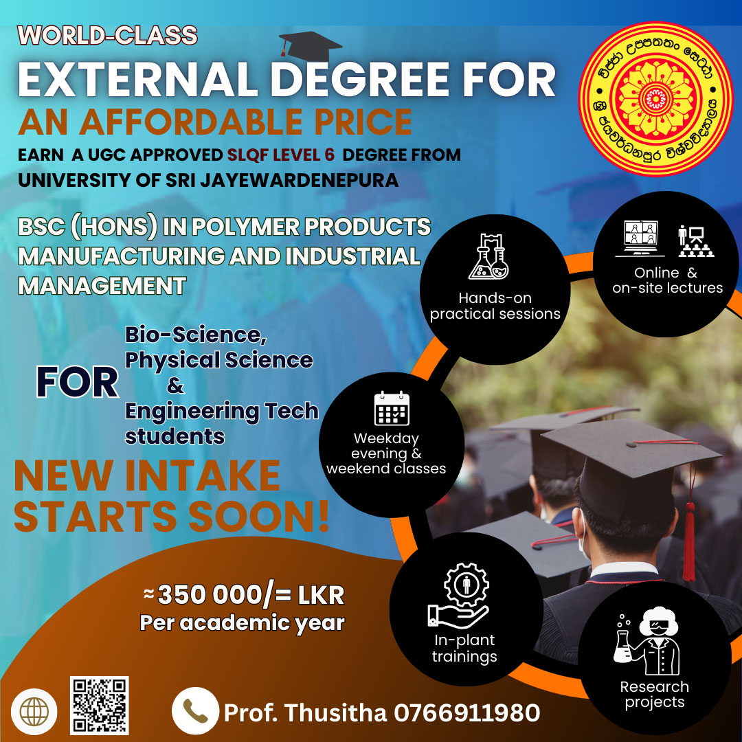 At present the DPS is conducting Polymer Science and Technology (PST) undergraduate courses under three categories: BSc (Honors) in Polymer Chemistry (PCH), BSc (Honors) in Applied Sciences (Polymer Stream) and BSc General degree. PST contains Chemistry, Physics, and Polymer Science and Technology as subjects. Students from physical and biological science streams who have an interest in the field of polymer science can admit to the program. The current intake is limited to maximum of 65 students per academic year. After completion of first two years based on their performance (GPA), the students can be selected to study PCH program or BSc (honors) in chemistry or Physics. Those who selected for PCH degree programs have to exclusively take PST related courses offered by the department for another two years. The rest of the students have opportunity to study another year and complete a BSc general degree. BSc general degree students have an opportunity to further study an extended year to obtain a BSc (honors) degree in Applied Sciences.