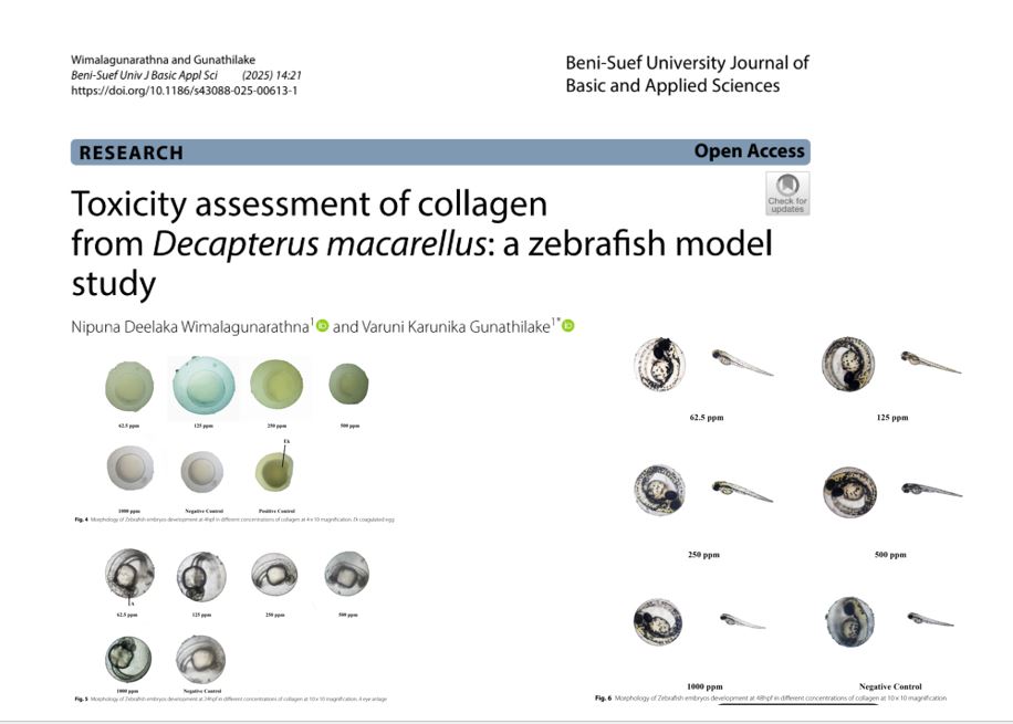 The results confirm the extracted from D. macarellus is nontoxic and causes no teratogenic effects in zebrafish embryo development. It further validates the potential of using collagen as a biocompatible material, where non-toxicity and developmental safety are paramount.